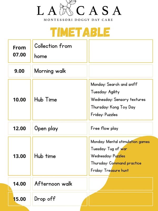 Having a schedule offers a layout and breakdown of activates in order to enrich your dog's time with us. Simply caring for them is not enough, by promoting mental stimulation we help you build a confident, social and happy dog.